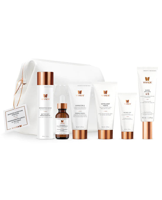 This Brighten & Restore Programincludes a complete routine of products designed to improve the look of dark spots, fine lines, irregular texture and tone, while protecting against future damage and recapturing a natural healthy glow.