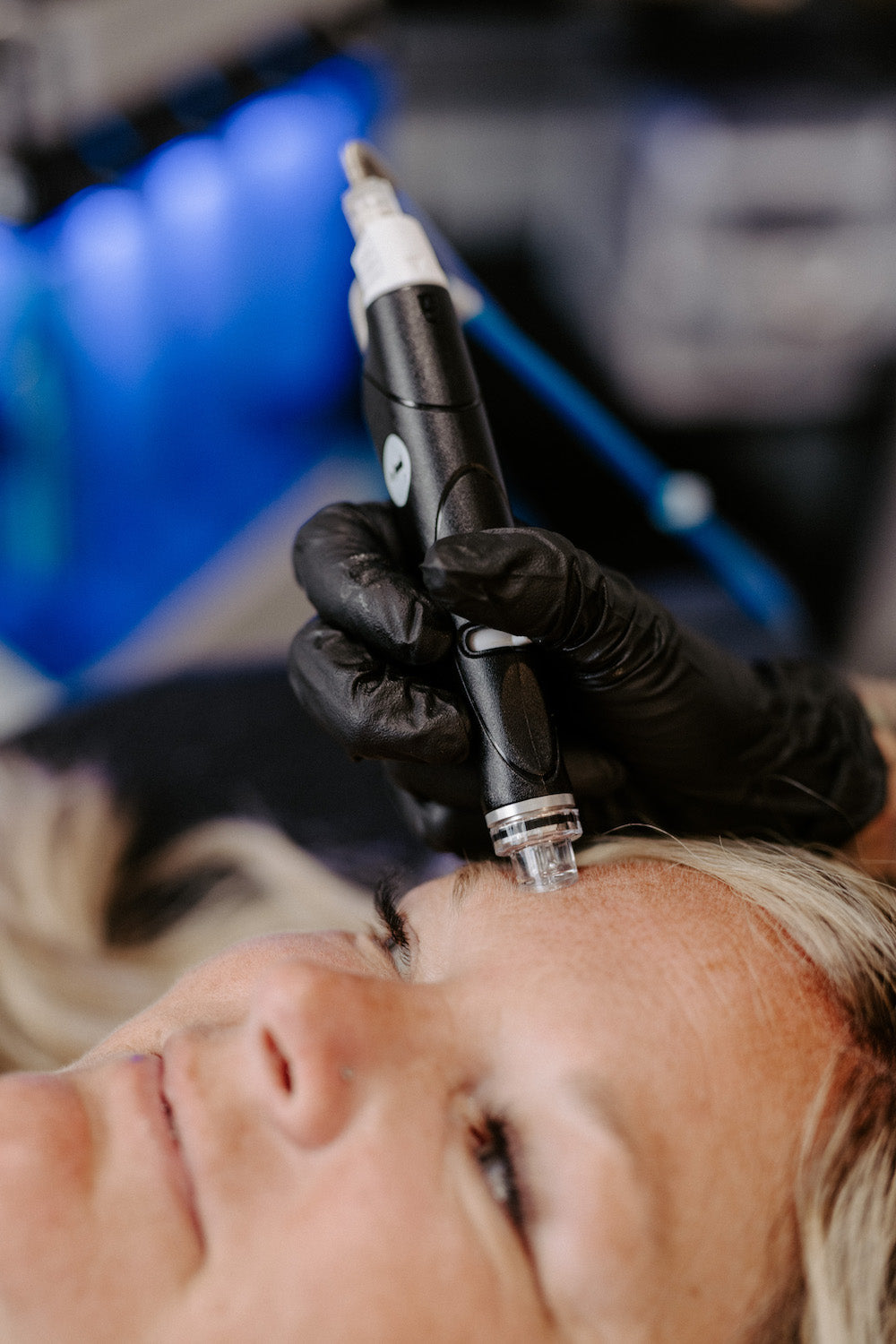 We begin with a HydraFacial to deeply cleanse and exfoliate. Then, we follow with the ProGenesis Laser, which uses gentle, non-ablative laser energy to stimulate collagen production, improve texture, reduce redness, and refine pores without downtime. Finally, we move back to HydraFacial to deeply infuse the skin to hydrate, nourish and protect.